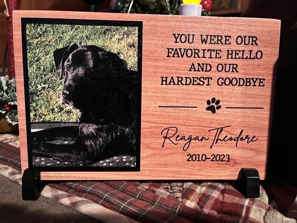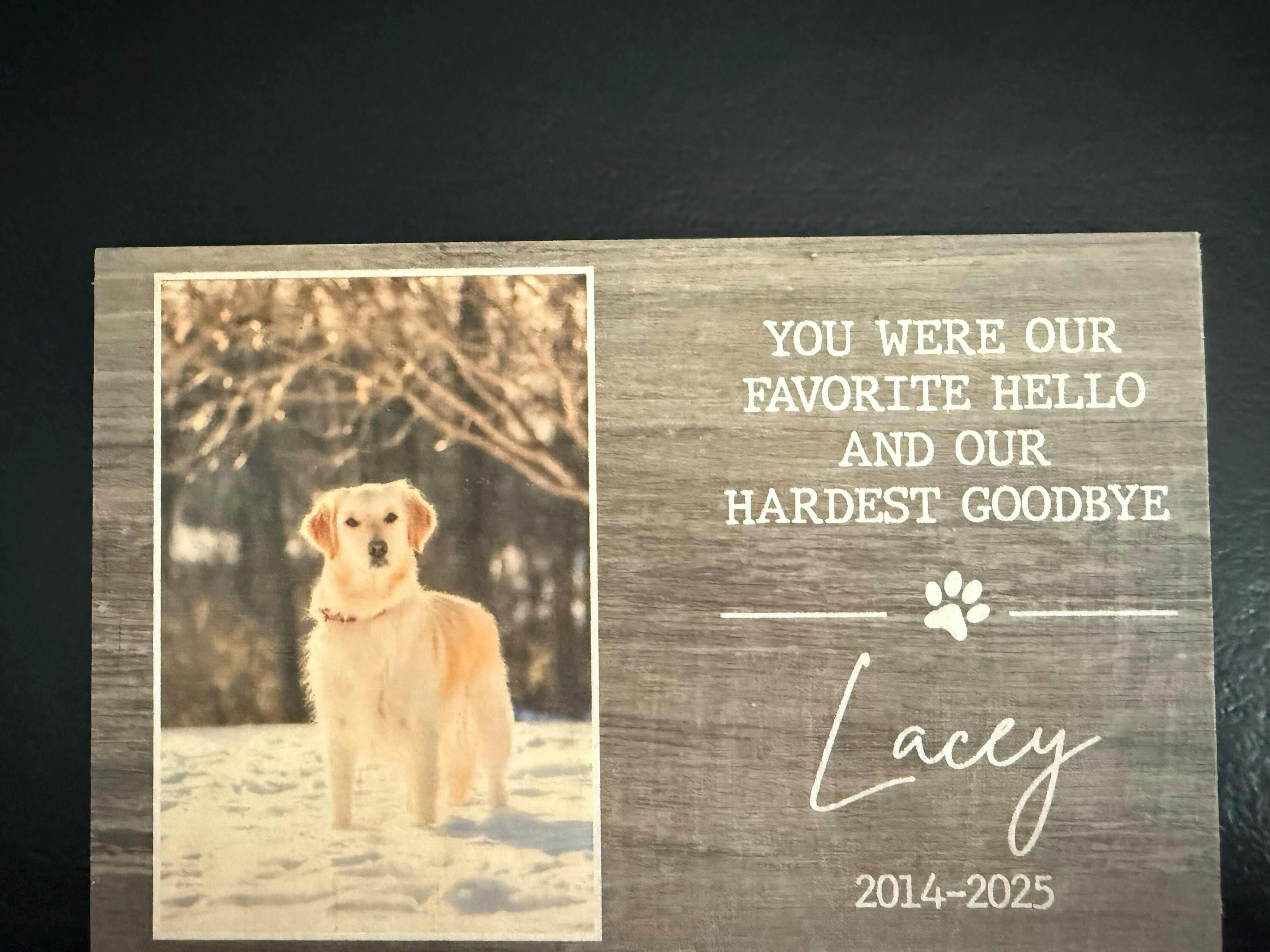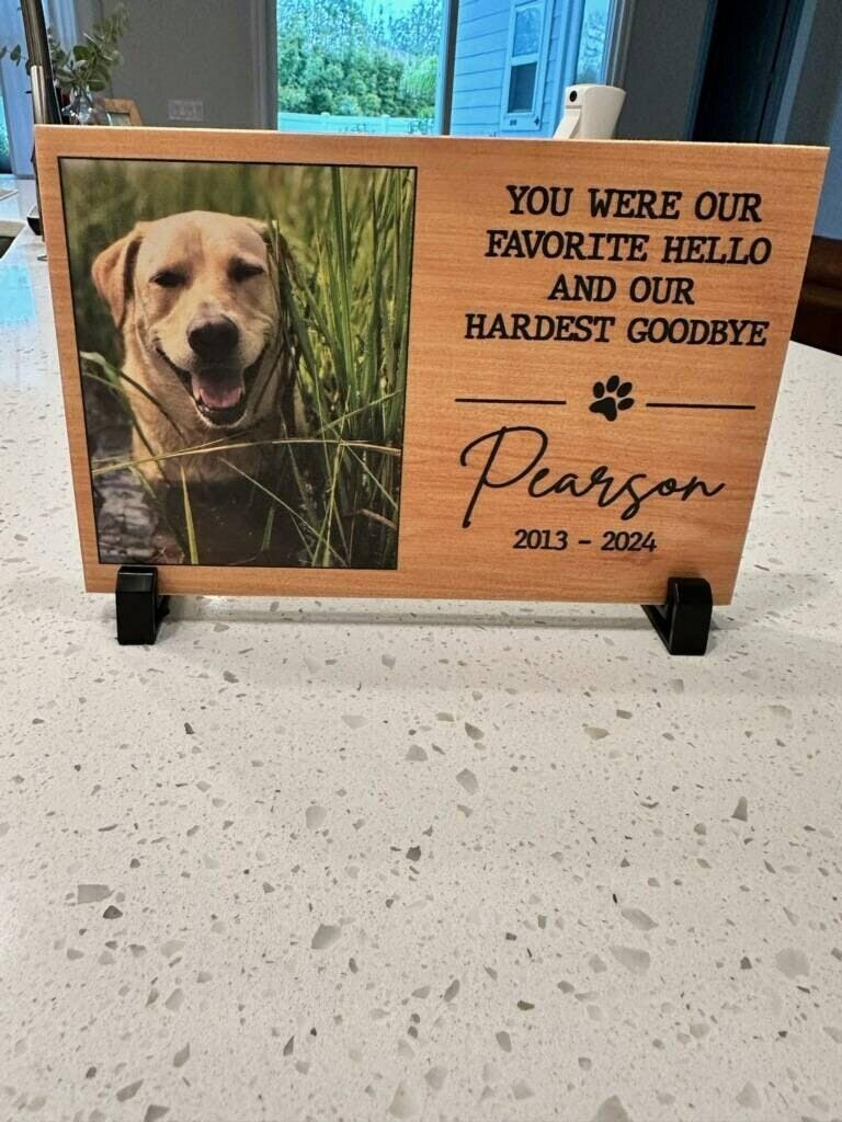 This pet memorial is more than just a sympathy gift for dog loss; it’s a meaningful pet remembrance plaque that offers loss of dog support through a tangible tribute. Featuring the touching phrase "You were our favorite hello and our hardest goodbye," this custom pet photo gift serves as a beautiful reminder of the bond you shared.